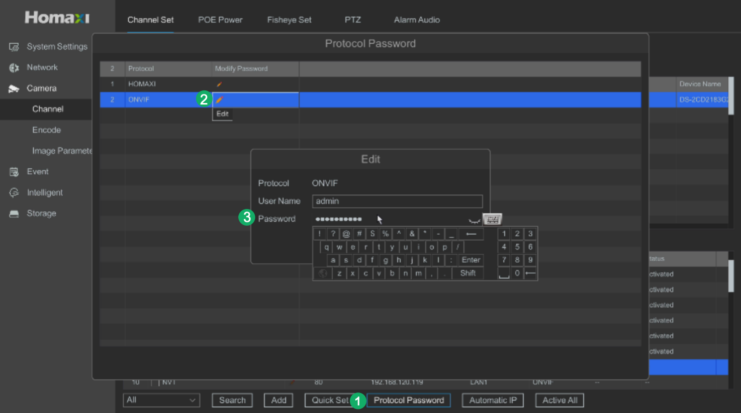 - Go to Setting Menu → Camera → Channel → Channel Set, set the NVR channel to Manual. Fill in the password of the IPC and set the Protocol to ONVIF.